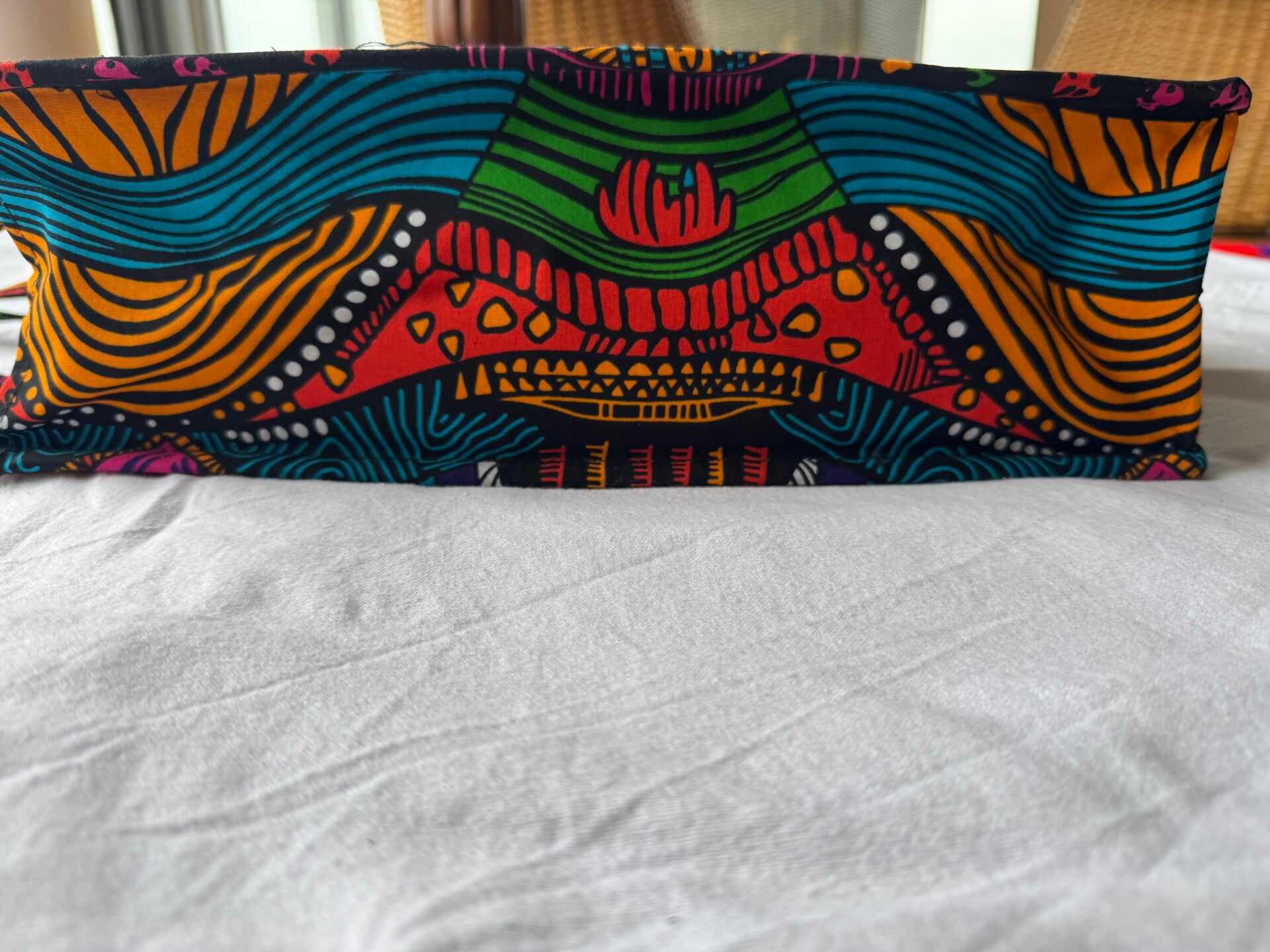 Shoulder bag with vibrant african pattern print.